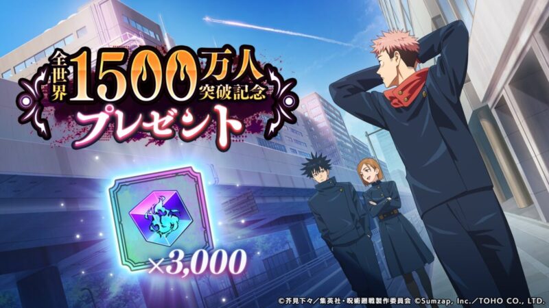 呪術廻戦ファントムパレード(ファンパレ)の全世界1500万人突破記念プレゼント!のお知らせを紹介。