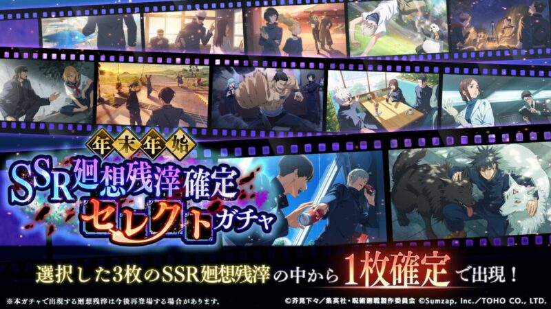 呪術廻戦ファントムパレード(ファンパレ)の「年末年始SSR廻想残滓確定セレクトガチャ」開催予告!のお知らせを紹介。