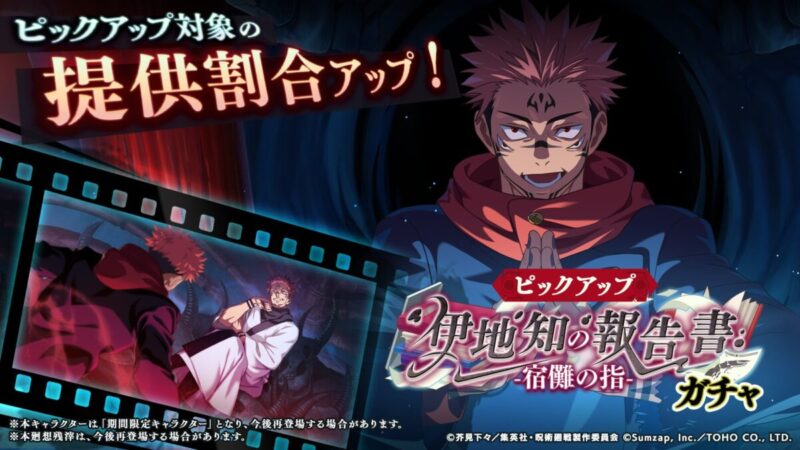 期呪術廻戦ファントムパレード(ファンパレ)の間限定SSRキャラ[本物の呪術]両面宿儺が新登場!「伊地知の報告書:宿儺の指ガチャ」開催予告!のお知らせを紹介。