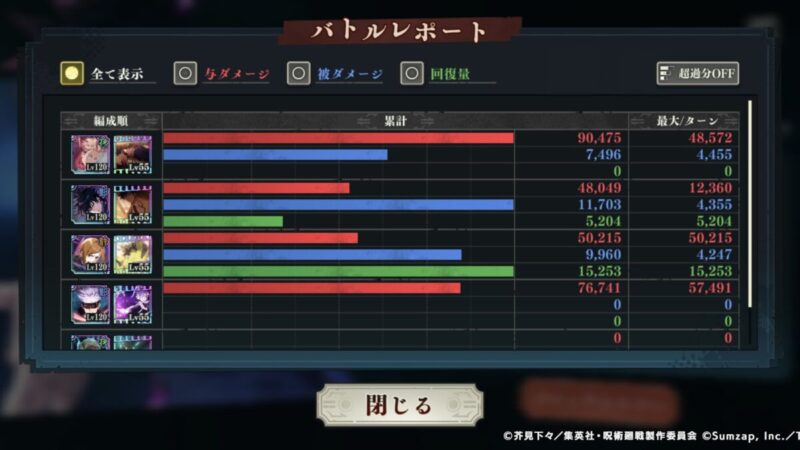 新機能「バトルレポート」は、編成中の各キャラクターがバトル中に与えたダメージなどを確認できる機能です。