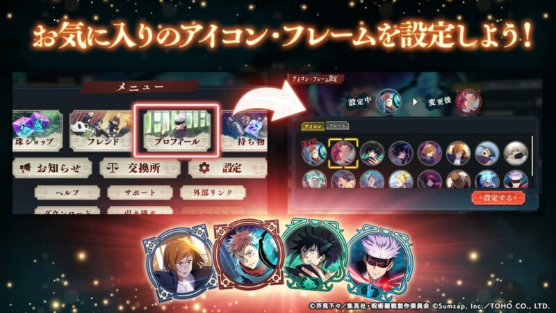 呪術廻戦ファントムパレード(ファンパレ)の新機能「プロフィールアイコン・フレーム」登場予告!のお知らせを紹介。