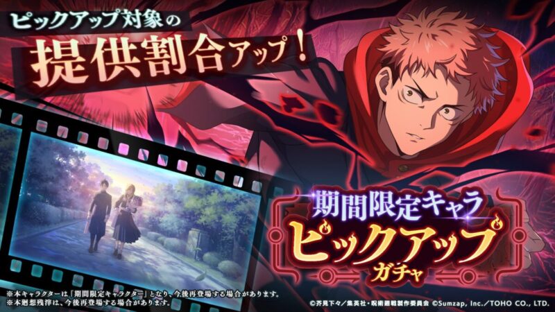 呪術廻戦ファントムパレード(ファンパレ)のSSR[ゾーン]虎杖悠仁が再登場!「期間限定キャラピックアップガチャ」開催予告!のお知らせを紹介。