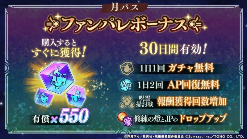 ・ファンパレボーナスを追加購入した場合、呪霊掃討戦の報酬獲得可能回数は即時に付与されず、次のファンパレボーナスが適用された日の0:00に付与されます。