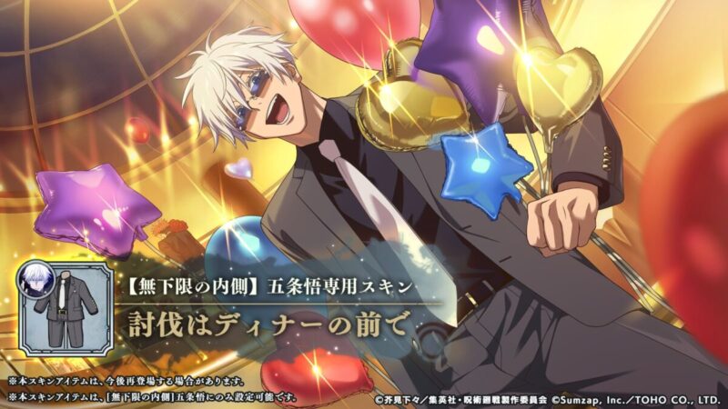 [無下限の内側]五条悟専用スキン「討伐はディナーの前で」は、[無下限の内側]五条悟に設定することで、イラスト、ちびキャラ、バトル演出などを変更することができるアイテムです。開催期間 | 2025年6月11日(水)15:00~7月3日(木)14:59 |