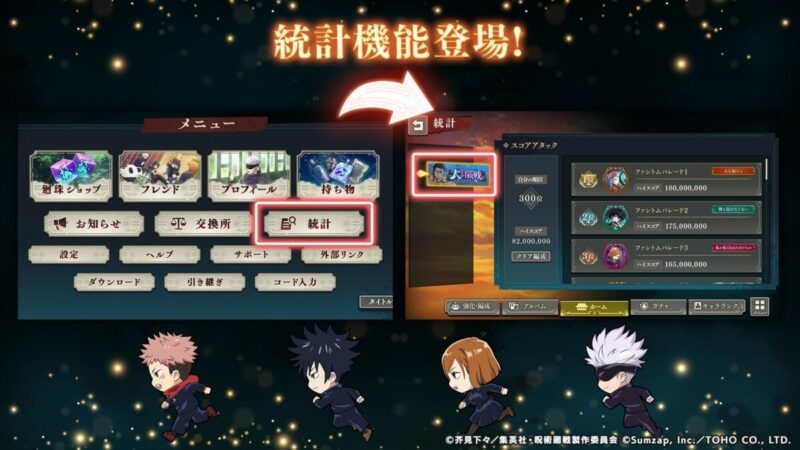 呪術廻戦ファントムパレード(ファンパレ)の新機能「統計」登場予告!のお知らせを紹介。