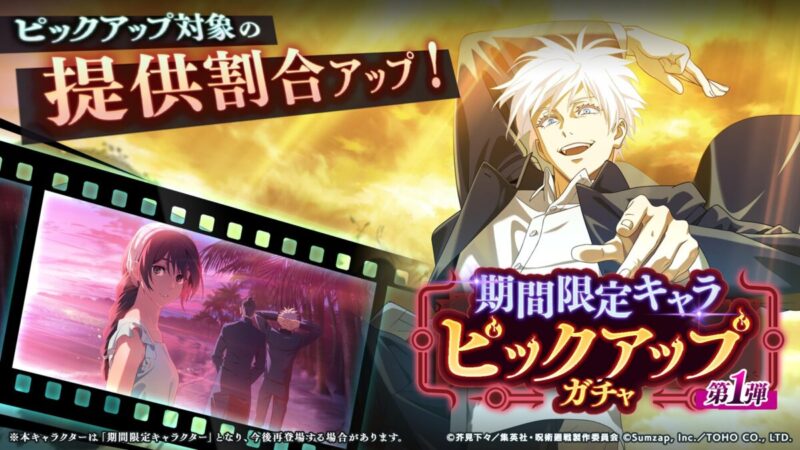 呪術廻戦ファントムパレード(ファンパレ)のSSR:五条悟【覚醒】が再登場!「期間限定キャラピックアップガチャ(第1弾)」開催予告!のお知らせを紹介。