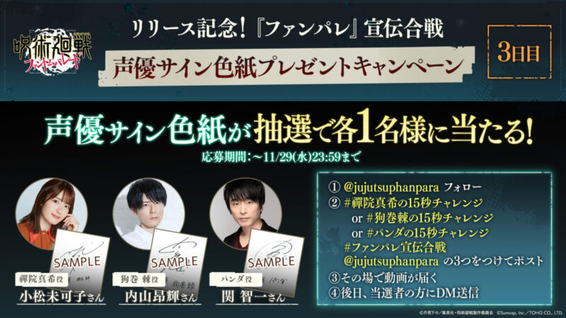 呪術廻戦のアプリ:ファンパレ(ファントムパレード)の「#ファンパレ宣伝合戦」の3日目が始まりました。抽選で小松未可子さん/内山昂輝さん/関智一さんのサイン色紙が当たります。