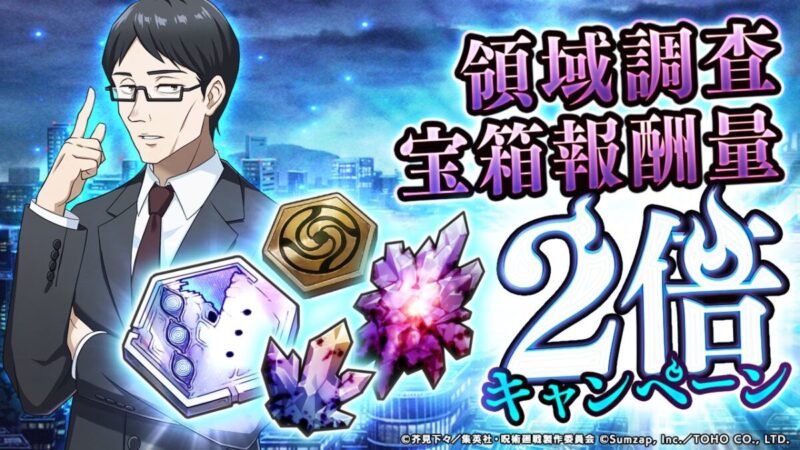 呪術廻戦のアプリ:ファンパレ(ファントムパレード)の「領域調査」にて、宝箱報酬量2倍キャンペーンが開催されます。