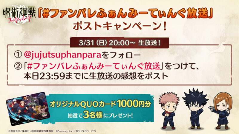 呪術廻戦ファントムパレード(ファンパレ)の「ポストキャンペーン」を紹介。抽選で3名様に『#ファンパレ』オリジナルQUOカードをプレゼント!