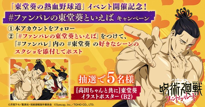 ※理由を入れると当選確率UP!#呪術廻戦 #ファンパレ東堂葵イベント— 『呪術廻戦 ファントムパレード(ファンパレ) 』公式 (@jujutsuphanpara) April 2, 2024
