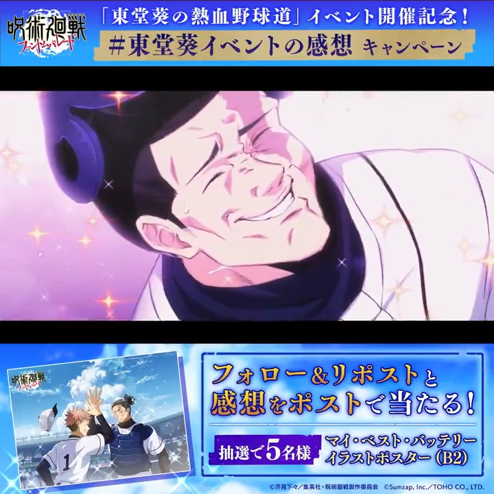 「マイ・ベスト・バッテリー」イラストポスター(B2)が当たる!#ファンパレ #呪術廻戦 #ファンパレ東堂葵イベント pic.twitter.com/rCo44Aw6CZ— 『呪術廻戦 ファントムパレード(ファンパレ) 』公式 (@jujutsuphanpara) April 3, 2024
