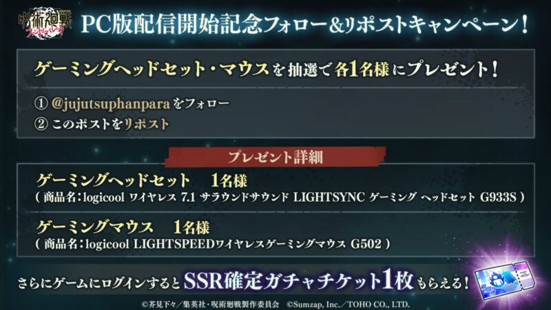 呪術廻戦ファントムパレード(ファンパレ)の【PC版配信開始記念】フォロー&リポストキャンペーン開催!ゲーミングヘッドセット・ゲーミングマウスが抽選で各1名様に当たる!