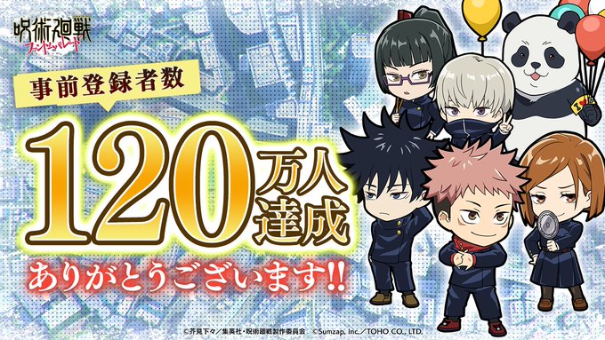 呪術廻戦のアプリ:ファンパレ(ファントムパレード)の事前登録者数が120万人を達成しました。