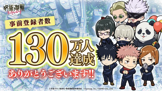 呪術廻戦のアプリ:ファンパレ(ファントムパレード)の事前登録者数が130万人を達成しました。