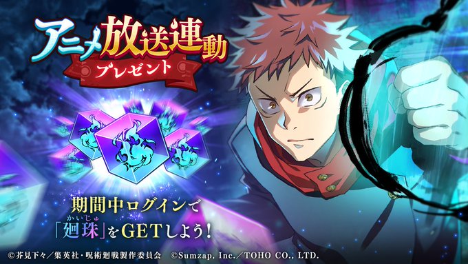 呪術廻戦のアプリ:ファンパレ(ファントムパレード)のアニメ放送連動プレゼントが開催されます。毎週金曜 0:30 ~ 次週木曜 23:59の間にログインすることで、「廻珠x300」を受け取ることができます。