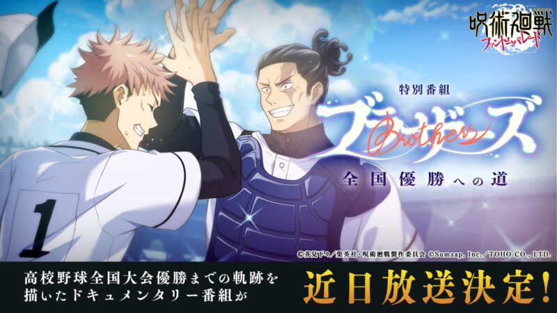 虎杖悠仁と東堂葵の高校野球全国大会優勝までの軌跡を描いたドキュメンタリー番組「ブラザーズ~全国優勝への道~」の放送が決定しました。