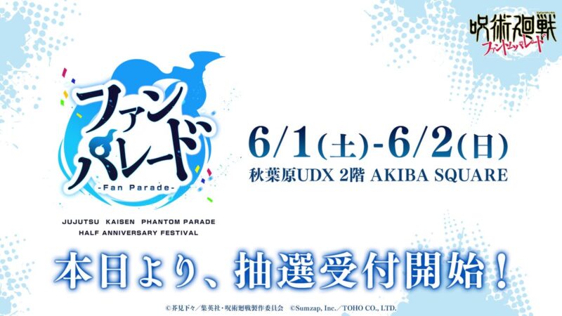 呪術廻戦ファントムパレード(ファンパレ)のハーフアニバーサリーリアルイベント「ファンパレード』開催決定!のお知らせを紹介。