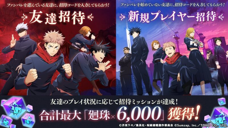 呪術廻戦ファントムパレード(ファンパレ)の新機能「友達招待」開催中!のお知らせを紹介。