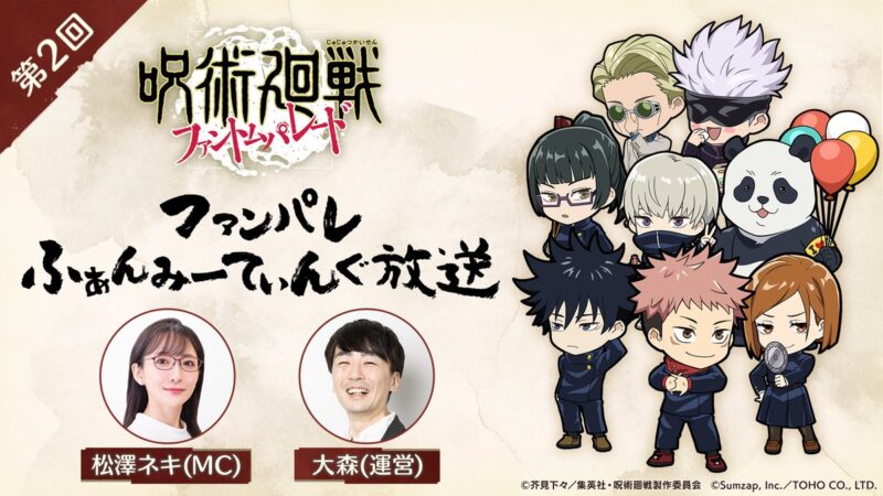 呪術廻戦ファントムパレード(ファンパレ)の「ファンパレふぁんみーてぃんぐ放送」予告!のお知らせを紹介。