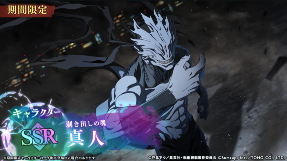呪術廻戦ファントムパレード(ファンパレ)の真人【剥き出しの魂】の性能と評価・使い方/おすすめ残滓を紹介。2周年:真人(幻SSR)のステータスやコマンドスキルなどの使う技、強い点やオート時の行動、プレイ動画や入手方法、会心率/黒閃率などの独自の検証データをまとめています。
