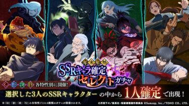 呪術廻戦ファントムパレード(ファンパレ)の「幻」「影」「夜」「行」の各特性別に開催!「年末年始:SSRキャラ確定セレクトガチャ」開催予告!のお知らせを紹介。 お知らせの内容 『呪術廻戦ファントムパレード』をご利用いただき、誠にありが[…]