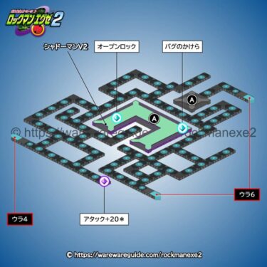 ロックマンエグゼ2のウラインターネット6の攻略マップと出現する敵を紹介。ウラインターネット6のマップ画像やゲートのコード解除方法、ミステリーデータの場所と中身、出現するウイルスと属性をまとめています。