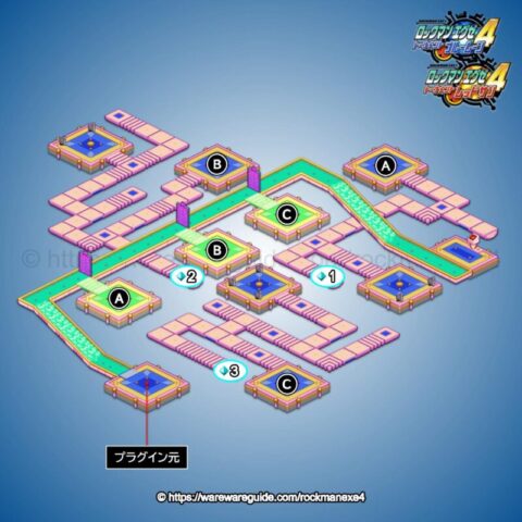 ロックマンエグゼ4(レッドサン/ブルームーン)のぬいぐるみロボの電脳の攻略マップと出現する敵を紹介。ぬいぐるみロボの電脳のマップ画像やゲートのコード解除方法、ミステリーデータの場所と中身、出現するウイルスと属性をまとめています。