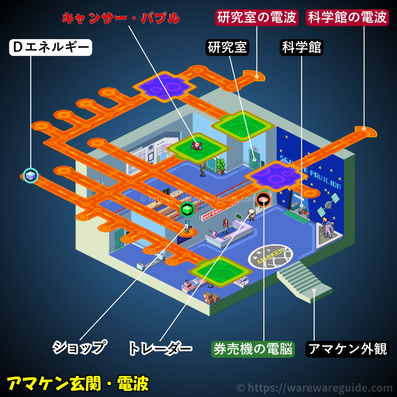流星のロックマン1(ペガサス/レオ/ドラゴン)のアマケン玄関の電波の攻略マップと出現する敵を紹介。アマケン玄関の電波のマップ画像やミステリーデータの場所と中身、出現するウイルスと属性をまとめています。