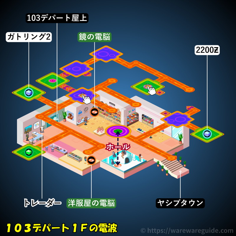 流星のロックマン1(ペガサス/レオ/ドラゴン)の103デパート1Fの電波の攻略マップと出現する敵を紹介。103デパート1Fの電波のマップ画像やミステリーデータの場所と中身、出現するウイルスと属性をまとめています。
