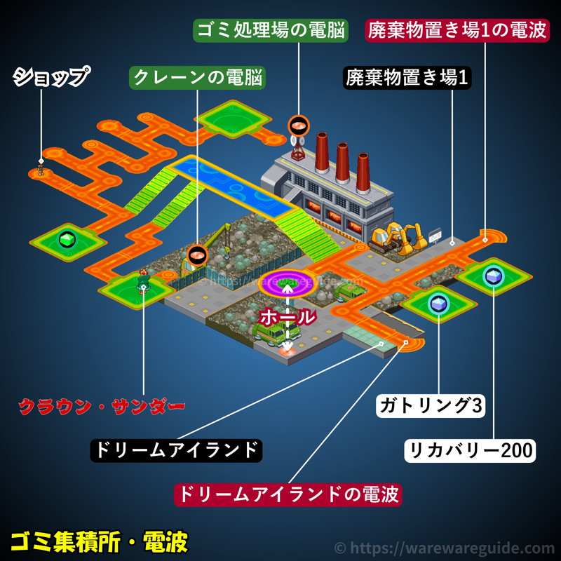 流星のロックマン1(ペガサス/レオ/ドラゴン)のゴミ集積所の電波の攻略マップと出現する敵を紹介。ゴミ集積所の電波のマップ画像やミステリーデータの場所と中身、出現するウイルスと属性をまとめています。