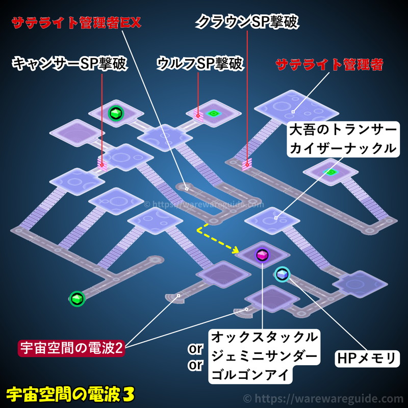 流星のロックマン1(ペガサス/レオ/ドラゴン)の宇宙空間の電波3の攻略マップと出現する敵を紹介。宇宙空間の電波3のマップ画像やミステリーデータの場所と中身、出現するウイルスと属性をまとめています。