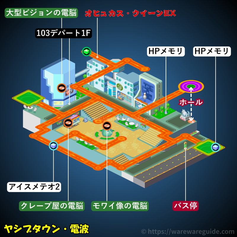 流星のロックマン1(ペガサス/レオ/ドラゴン)のヤシブタウンの電波の攻略マップと出現する敵を紹介。ヤシブタウンの電波のマップ画像やミステリーデータの場所と中身、出現するウイルスと属性をまとめています。