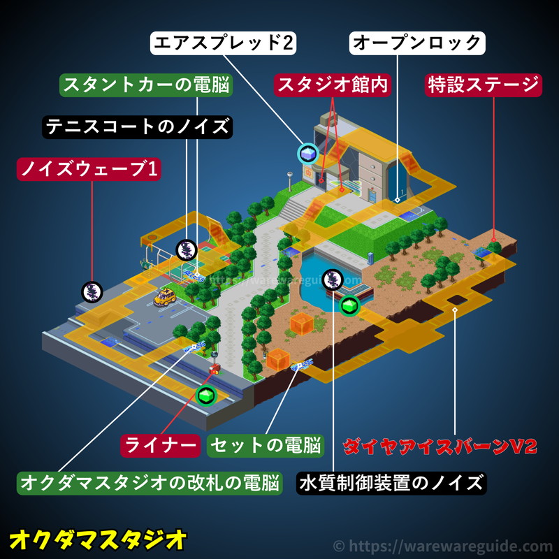 流星のロックマン3(ブラックエース/レッドジョーカー)のオクダマスタジオの攻略マップと出現する敵を紹介。オクダマスタジオのマップ画像やミステリーデータの場所と中身、出現するウイルスと属性をまとめています。